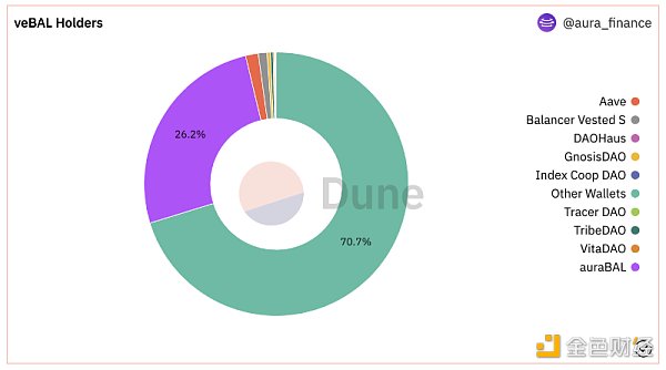 據 Dune 數據顯示,Aura 的$veBAL 持有占比為 26.2% ,通過$veBAL 的治理賄賂,LP 持有者將獲得更高的收益率。而 Balancer 流動性治理戰爭的優勢在于其比 Convex 更高的賄賂資本效率,最終 Aura 也將因此受益。