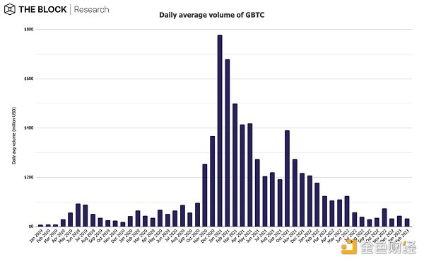 8、灰度的比特幣信托近GBTC日均交易額在一月下跌了25.4%,降至3260萬美元。