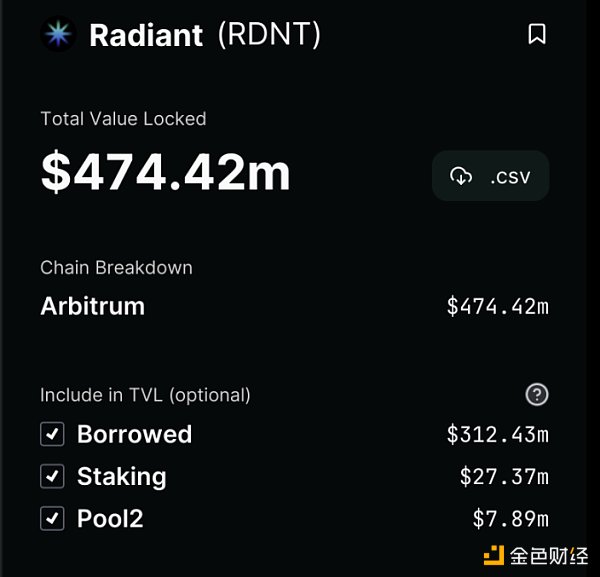 根據 Defillama 的數據,目前 Radiant(RDNT)中存入資產的 TVL 為 1.26 億美元;如果加上借的、質押的、Pool2 的,則整體 TVL 為 4.7 億美元左右。
