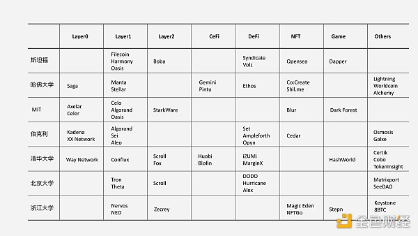 可總有一些“弄潮兒”早早就洞悉了這場技術與金融變革并積極投身其中。典型案例是Meta(Facebook)出來創辦的Aptos、Sui;高通出來創辦的Solana;以紅杉資本、a16z為代表的投資機構自2021年開始已在Web3領域投資573億美元; 全球頂級高校畢業的精英也加入這場“圈地運動”。根據Rootdata 收錄的哈佛大學、斯坦福大學、加州大學伯克利分校、麻省理工學院、清華大學、北京大學、浙江大學校友創立的 Web3 項目數據庫,我按照各個主要細分賽道做了以下統計:
