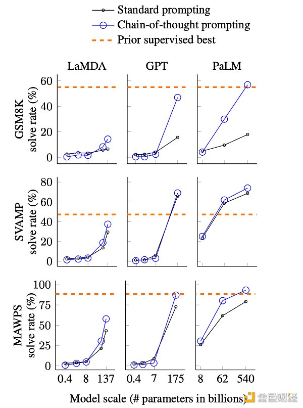 不同模型不同尺寸的思維鏈效果對比,圖來自論文。GSM8K,SVAMP 和 MAWPS 是三個需要邏輯推理的數學應用題數據集,LaMDA,GPT 和 PaLM 分別是 3 個不同的模型。