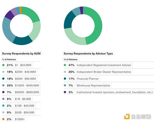Bitwise/VettaFi 2023 年財務顧問對加密資產態度基準調查的目標是衡量美國財務顧問對加密市場的看法,包括他們是否認為將客戶資產分配到該領域是合適的。調查旨在對來自全美各地的不同類型顧問進行交叉抽樣,包括獨立注冊投資顧問 (RIA)、經紀自營商代表、財務規劃師、金融服務公司代表和機構投資者。展開調查的時間為 2022 年 11 月 25 日至 2023 年 1 月 6 日。