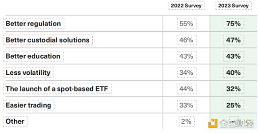 監管仍然是最大的障礙,但其重要性在 2022 年動蕩的新聞流中飆升:75% 的顧問將「更好的監管」稱為提高他們對加密資產配置信心的關鍵一步,高于前一年的 55%。另一個因素是波動性:40% 的人希望看到波動性降低,而前一年這一比例為 34%。今年的結果不太突出:推出基于現貨的 ETF(32% 對前一年的 44%)和更容易的交易(25% 對前一年的 33%)。