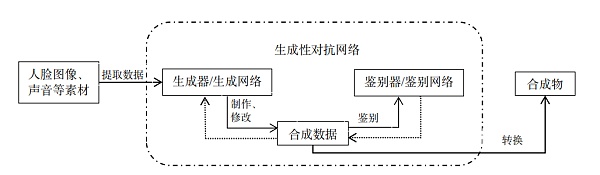 在圖像、音頻類深度偽造模型中,生成網絡”(generative network)或“生成器”(generator)負責制作復制原始數據集特征的合成數據如圖片、音頻記錄、視頻等,并制作“深度合成物”;鑒別網絡(discriminative network)或者說鑒別器(discriminator)則負責識別合成的數據,檢測該視頻是否為偽造。通過反復的“無監督學習”過程,“生成網絡”制作并修改“深度合成物”,直到“鑒別網絡”無法再檢測出該合成物系經“深度合成”,最終形成高保真的信息內容。