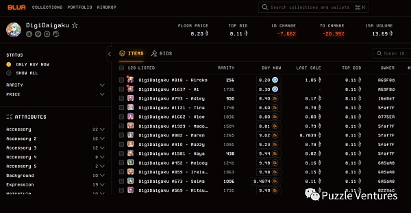在Blur之前,也有?些專業的?具,例如Trait Sniper等,但是他們?多是收費的,功能也主要在于項?開圖時秒殺稀有NFT。市場迫切需要?個更強?得聚合?具來整合瀏覽,秒殺和批量購買,減少信息滯后和??加載時間,?且還要免費使?,Blur就這樣誕?了。