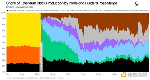 截至2022年12月31日,75%的MEV-Boost區塊由Flashbots構建者構建。通過競爭,Flashbots構建者的主導地位正在逐漸減弱。由匿名構建者構建的區塊的比例從2022年9月的不到10%增加到2022年12月底的近50%。