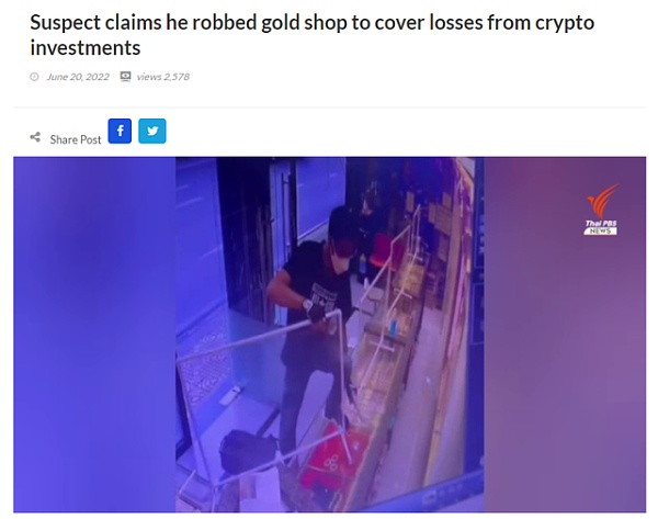 2022 年 6 月,加密貨幣大跌之后,一名泰國男子搶劫了曼谷一家金店約 200 萬泰銖的金項鏈,逮捕歸案后,該男子表示,他是因為加密貨幣帶來嚴重損失導致其產生犯罪想法。