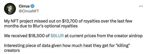 其次,雖然可選版稅讓很多 NFT 創作者失去了部分報酬,但 Blur 會給仍然選擇上架該市場的創作者空投,如推特賬號 @CirrusNFT 表示其 NFT 項目在過去幾個月中錯過了 13700 美元的版稅收益,但是他們從 Blur 的創作者空投中收到了 18500 美元的 BLUR 代幣,進而彌補了這部分損失。