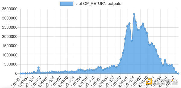 從 2018 年到 2019 年,大約 20% 的比特幣交易是 OP_RETURN 交易。這些交易被用于 Omni(早期 Tether 穩定幣的基礎)、Counterparty(用于 Rare Pepes 的早期 NFT 協議)和 Veriblock(一種基于比特幣的山寨幣)。它們中的每一個都依賴于 OP_RETURN 來運行,并且它們的流行使得當時比特幣網絡費用相當昂貴。這些 OP_RETURN 應用程序的支持者斷言,高費用是好事:它提高了對比特幣區塊空間的需求,并向礦工支付更多費用以確保網絡安全。反對者認為,它們排擠了比特幣網絡中的金融交易。
