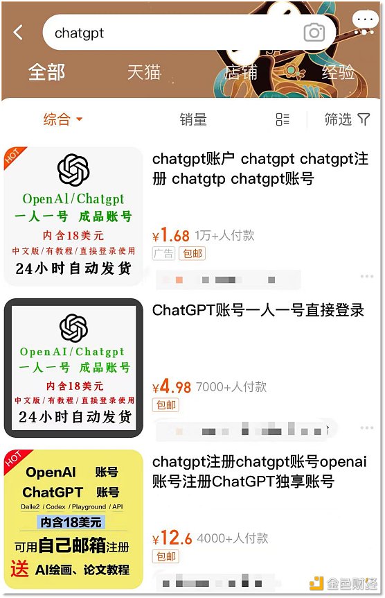 2個月后,當你還在圍觀ChatGPT會不會搶程序員、記者、人工客服甚至公務員“飯碗”的新聞時,售賣ChatGPT賬號的淘寶商鋪賣號生意賺得盆滿缽滿。在淘寶搜索“ChatGPT”,可以看到數十家售賣賬號的商鋪,其中超過5家店鋪有數千人付款,最多的商鋪成交量在“1萬+”,足見國內用戶對該應用的需求。