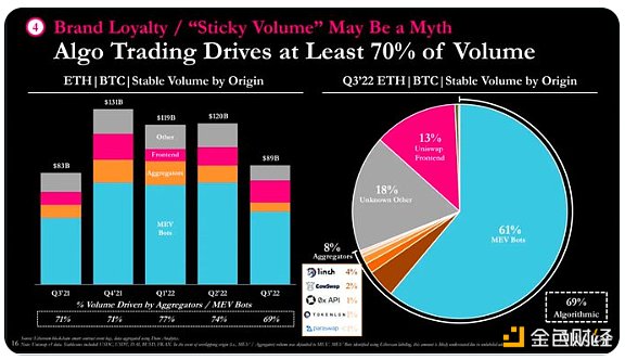 Uni v3上的大多數交易量并不具“粘性”,因為其中超過70%的交易量是由算法驅動的。交易量只是追隨定價。