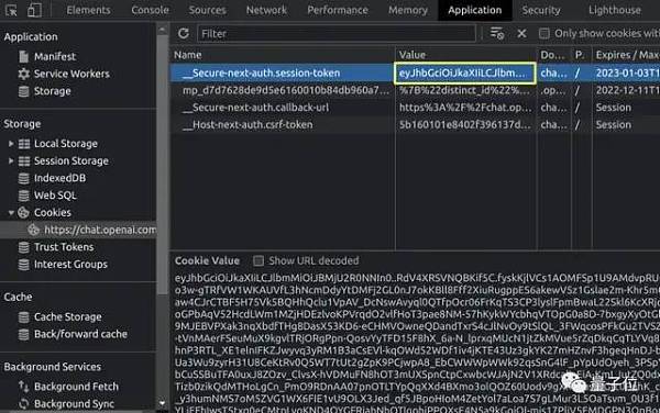 方法為登錄ChatGPT網頁,點擊“開發者工具”,進入Application欄,在Cookie下拉菜單找到chat.openai.com,就能看到Secure-next-auth.session-token的值: