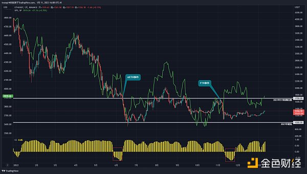 從 stETH 事件以來的走勢來看,BTC 創出年內新低,而 ETH 在新低前止跌反彈,BTC 相對弱于 ETH。