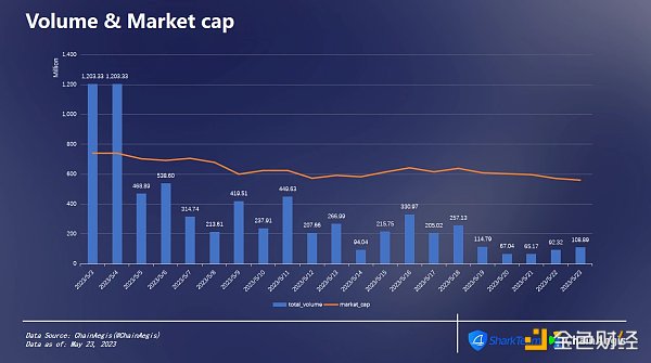 5 月3 日,$SUI價格為1.3 美元,4 日價格達到ATH,為1.48 美元,當時市值達到785, 883, 732 美元。5 與3 日和4 日,這兩日的交易量也較高,均為12.03 億美元。之后幾日的交易量有所減少,除去上線之初那兩日的交易量,剩余幾日交易量的平均水平在2.45 億美元左右。