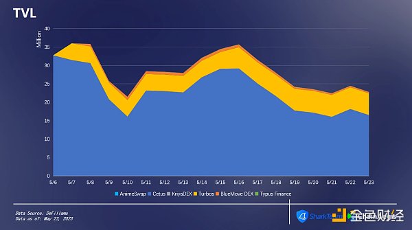 Cetus目前是Sui主網上TVL最高的DEX,具有單邊質押和LP挖礦功能。5 月23 日,Cetus的TVL為16, 479, 615 美元,占總TVL的72.18% ,高峰時超過3000 萬美元。Turbos是一個集中流動性的代幣交易平臺,23 日的TVL為5, 880, 224 美元,占總TVL的25.76% ,排名第二。