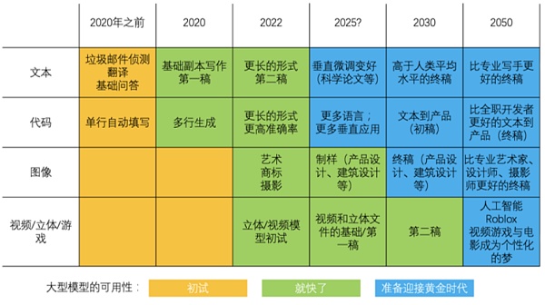 在這樣的情況下,人工智能和教育之間發生了非常顯著的重合。我在這里提供了一個表格,橫格是時間,豎格是內容。內容包括了文本、代碼、圖像、視頻、3D等領域。我們現在處在2022年到2030年之間,所有的文本、代碼、圖像和視頻全部面臨著突飛猛進的時代,藍色表明準備迎接黃金時代。人工智能在文本、代碼、圖像、視頻上的突破,改變了職業教育的基礎結構。