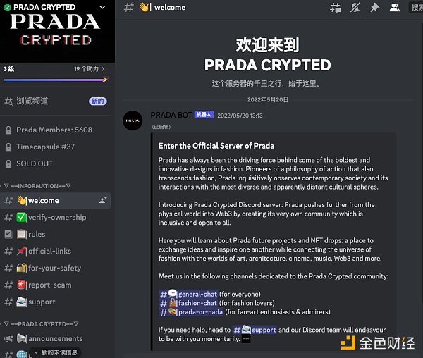 作者沒有時間膠囊NFT,但也加入了這個Discord服務器。在這里,Prada會公告NFT發行的所有事情,也會發送一些品牌消息。而在公共的頻道,用戶可以進行自由交流,也開放了中文頻道。怎么說呢?有了Discord,確實有點像一個“家園”。