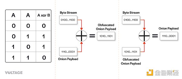 然后,Alice 使用 rho key 創建一個隨機字節串,并對上一步得到的洋蔥負載使用異或(XOR)運算,得到混淆后的負載。負載的原文可以通過對混淆文使用這個隨機字節串的 XOR 運算得到(譯者注:換言之,這里的 XOR 就是對稱加密的算法,而隨機字節串就是密鑰)。XOR 操作會逐比特對比洋蔥負載和(由 rho key 生成的)隨機字節串,僅當其中一個數據的比特是 1 時,才會輸出 1;這就得出了一個混淆后的負載。XOR 操作巧妙的地方在于,只要你得到了對的那個隨機字節串以及混淆后的負載,只需用兩者再次運行 XOR 操作,就可以得到混淆之前的負載。