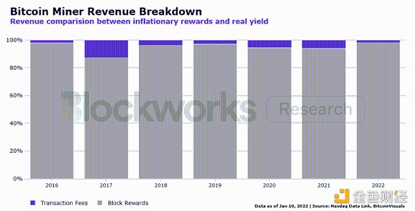 但分析一下收入構成,就會發現背后的問題......比特幣通過區塊獎勵大量補貼安全性。95%的比特幣礦工獎勵來自通貨膨脹的區塊獎勵,而只有 5%是來自交易費的真實收入。