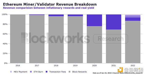 將 2022 年分為合并前和合并后的時代,顯示了以太坊如何通過驗證者收入的多樣化來解決通貨膨脹問題。合并后,以太坊驗證者從交易費、ETH 燃燒和 MEV 支付中獲得 62%的實際收入。