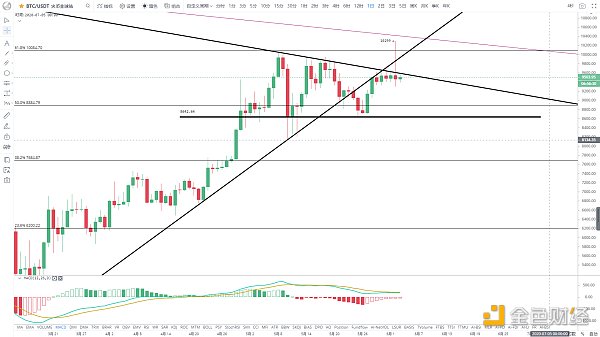 這一波下砸,價格砸破雙底頸線10000美金支撐,再度跌回至前期運行的下降三角區間內,不過仍位于多層日均線上方運行,下方均線系統纏繞粘合,匯聚區域9300附近的支撐還是較強的,并且前期的區間震蕩平臺也未跌破,同時價格依舊沿著三角趨勢線附近震蕩,并未遠離,所以目前不能判定趨勢已走弱,整體還是震蕩行情,隨著時間的延伸,也是有機會被動突破所處的下降三角,目前壓力區域9750-9800區間,MACD指標線持平粘合,也預示著再次變盤的臨近,只要不有效跌破9300支撐,后市仍有繼續上攻的機會。
