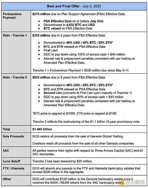 Winklevoss 表示,經過數月的談判和調解,他提出了針對 Genesis 債務重組談判的“最終報價”,要求以美元、比特幣和以太坊計價的 14.65 億美元的付款和貸款。他此前還曾提出一份名為“最佳和最終報價- 2023 年 7 月 3 日”的文件,并由此列出了一系列的計劃大綱。