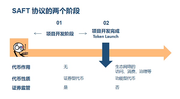 SAFT 旨在為 Web3 項目提供了一條基于美國證券法體系下的合規 Token 發行路徑。SAFT 約定由項目方以未來網絡上線后代幣的認購權作為對價,來換取投資者當下的資金,用于項目網絡當下的開發建設。由于權益型代幣(Security Token)是各個司法轄區的重點監管對象,SAFT 通過建立一套協議機制,最終實現功能型代幣(Utility Token)網絡上線的效果,來規避美國證監會及相關法律對于 Web3 項目代幣投融資行為的監管。