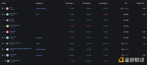 DeFi項目鎖定資產前十排名及鎖倉量 數據來源:defillama