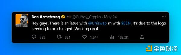 然而就在PSYOP代幣事件沸沸揚揚之時,Uniswap突然在沒有任何公告的情況下停止了BEN代幣交易服務(或許是出于對潛在風險的擔憂),不過Ben Armstrong聲稱是因為BEN代幣項目LOGO需要更換才導致暫時下架。