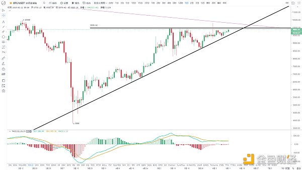 技術圖形上,整體也是日線上升三角形末端整理,即將出方向,頸線壓制10000美金,日線放量突破站穩,將會構筑一個日線頭肩底結構,后面繼續挑戰前高10500將是大概率,突破將繼續向上挑戰11000區域,為歷史最高19800與19年頂點14000連線的長期趨勢線位置,從頭肩底的理論目標位至少也是11000上方區域,所以后面要多加注意,從MACD日線快慢線都快粘合持平走成直線了,也預示著行情大波動的臨近,操作上不破9500繼續持有,等待后續的變盤。