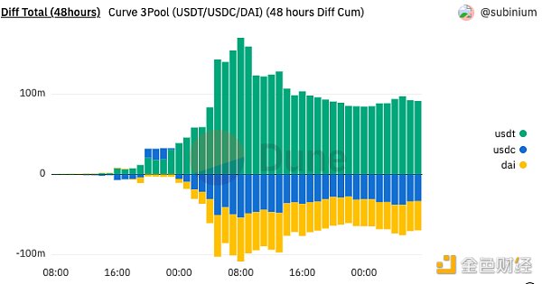 在6月15日的USDT案例中,是投資者在售出USDT,換取USDC或者DAI。Curve 3pool的USDT的流入流出情況也說明了如此,24小時內Curve 3pool流入約2億美元的USDT。