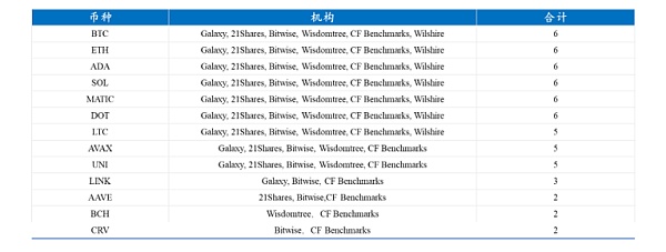 那么就當前市場上的虛擬資產指數而言,哪些虛擬資產有被允許向散戶提供交易的可能?根據整理市場數據,目前提供虛擬資產指數并受市場認可的機構主要有 Galaxy,21Shares,CF Benchmarks,Bitwise,Wisdomtree 和 Wilshire 六家機構。