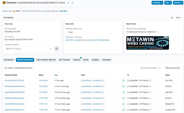 同時,我們用Beosin KYT追蹤發現,出售 NFT 所獲收益 2 萬 ETH 已全部轉入多簽合約 0x2aE6B0630EBb4D155C6e04fCB16840FFA77760AA,截止發文時資金暫時沒有移動。