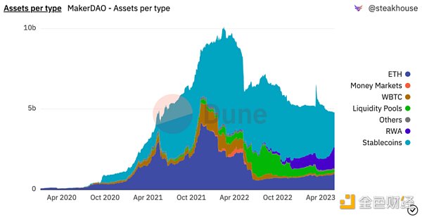 在 MakerDAO 的資產種類中我們也能清晰地看到真實世界資產 RWA( 如美國國債等資產 ) 的比重正在不斷增加,對穩定幣資產的依賴越來越少。