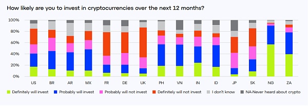 在展望擁有加密資產的未來時,亞洲和非洲通常更愿意投資加密資產:尼日利亞(90%肯定會或可能投資),南非(78%),菲律賓(57%),越南(57%),印度尼西亞(56%)和印度(53%)。這與歐洲和日本低得多的意愿形成鮮明對比,歐洲和日本有很高比例的受訪者確認他們肯定不會投資。