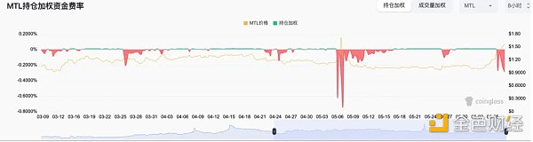 我們可以觀察到,MTL 的合約資金費率在 5 月 6 日出現異常,但軋空過快一天結束。然后 6 月 6 日再次出現異常,后期一度高達 -1.8% 的極值。更重要的是, 6 月 6 日起合約持倉量大幅攀升,持倉量 6000 萬美元,很接近流通市值 8000 萬美元。合約成交量 8000 萬美元,接近現貨成交量 1.6 億美元的 50% 。這波軋空行情 MTL 在一周時間內上漲了 2–3 倍。