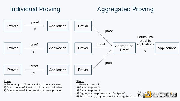 一旦生成了證明,就必須將它們反饋給應用程序。對于鏈上應用,這需要代價昂貴的鏈上驗證。證明市場可以將單一的證明反饋給開發者,或者他們可以使用聚合證明在返回之前將多個證明轉換為一個,將Gas成本分攤在它們之間。