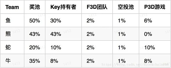 隊伍分為蛇、牛、熊、魚, 購買 Key 后,ETH 分配規則