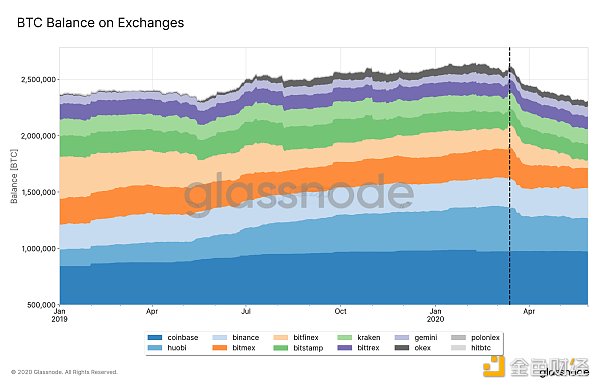 從 glassnode 的統計來看,很多交易平臺都出現了明顯的流出現象,其中流出最多的三大交易平臺是 Bitfinex(約 133,000 BTC,-66.6%)、BitMEX (約 105,000 BTC,-35.6%)和火幣 (約 97,000 BTC,-24.6%)。也就是說,自黑色星期四以來,Bitfinex 是流出量最多的平臺,BTC 余額與此前相比減少了 66.6%。