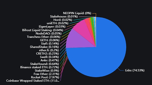 從圖1-4表達的質押主體分類占比來看,隨著以太坊質押總量增長,各類質押量同步水漲船高,但占比在發生變化。從最初質押以礦池、CEX為主,流動性質押(LS)量相對較少,但發展至今流動性質押成為王者,占據37.1%的份額,而CEX為20%,質押礦池為13.6%,很明顯后兩者的占比被流動性質押擠壓。