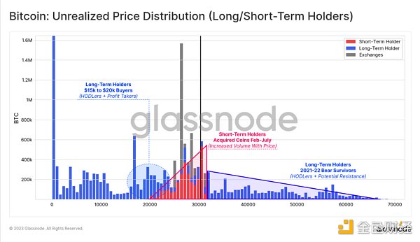 藍色部分:幾乎所有買入價格超過3萬美元的比特幣都由長期持有者持有。這些投資者要么是2021-2022年熊市的幸存者,要么是身經百戰的HODLers,要么是準備在價格反彈時進行拋售的人。