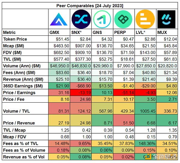 隨著競爭的加劇,GMX市場份額正在逐漸減少,如果v2不能給平臺帶來更多的交易量和費用,GMX的合理價格可能會落到40美元區間,市盈率大約為20。