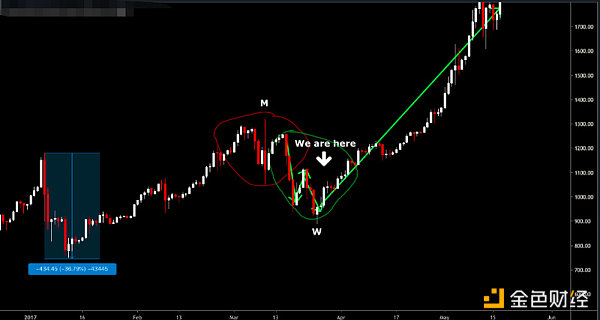 此后,比特幣價格恢復至崩潰前水平,并在此后出現預示著空頭行情的雙頂形態。但是,2017年出現見頂信號之后的回調,實際上是以一個不是很標準的W雙底形態結束的。此后幣價上漲了20倍,到達2萬美金高度。