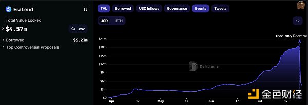 據DeFiLlama數據顯示,僅一天時間,EraLend 的TVL就從1851 萬美元下跌至457萬美元,單日暴跌約1400萬美元,降幅高達75.32%。