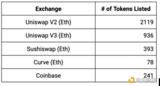 Uniswap控制著絕大多數長尾流動性。根據CoinGecko的數據,Uniswap擁有主要以太坊交易應用程序中最多的代幣上市量。