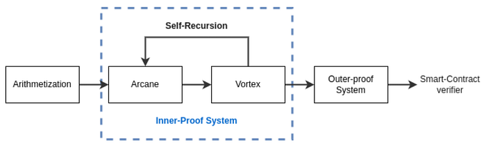接著Linea采用內部證明系統Vortex和Arcane,這些內部證明系統遞歸地減小證明的大小,通過優化計算和使用特定的算法,不斷提高證明的效率和緊湊性。