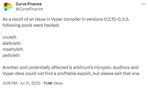 接著Curve官方推特發文表示,由于重入鎖出現故障,許多使用 Vyper 0.2.15 的穩定幣池 (alETH/msETH/pETH) 遭到攻擊,但其他池子是安全的。