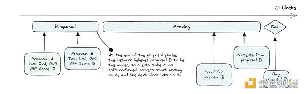 其中,BPW(區塊提議)階段是多個定序器Seuqnecer提出不同的區塊并競爭、Prover選擇某個備選區塊給出投票的過程。