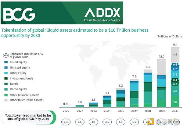 根據 BCG 和 ADDX 的研究,全球非流動性資產的代幣化將會產生 16 萬億美元規模的市場(這將接近 10% 的 2030 年全球 GDP)。花旗的 RWA 研報《金錢、代幣與游戲》,也預計在 2023 年將會有 10 萬億美元規模的市場將被代幣化。