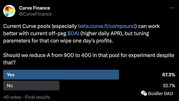 Michael(Curve 創始人)在推特上發起了一個投票,看大家是否支持把 Compound pool 的 A 參數從900調到400。